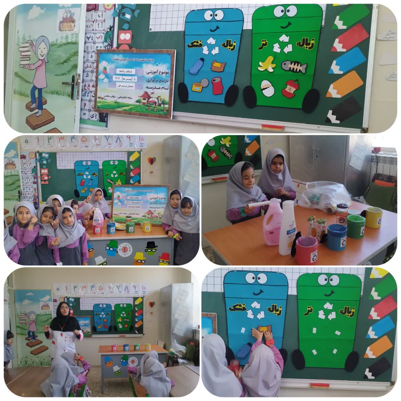 در روز شنبه ۵ مهر ماه ۱۴۰۴، دانش آموزان پایه اول دبستان مریم ضمن آشنایی با نماد بازیافت ؛ با انواع زباله خشک و تر، انواع زباله های خشک قابل بازیافت (کاغذ و مقوا، انواع پلاستیک مانند بطری نوشابه، قوطی شامپو، بطری آب معدنی، ظروف مواد شوینده، انواع شیشه مانند شیشه مواد غذایی، شیشه دارو، فلزات مانند قوطی کنسرو، قوطی رب گوجه) و همچنین انواع رنگ سطل های زباله آشنا شدند.