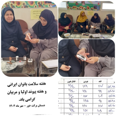 هفته سلامت بانوان ایرانی و هفته پیوند اولیا و مربیان گرامی باد به بهانه این دو هفته امروز یکشنبه ۲۷ مهر ماه ۱۴۰۴ طرح غربالگری قند، چربی و فشارخون کارکنان دبستان برکت و انجمن اولیا و مربیان سال تحصیلی جاری انجام و پس از آن صبحانه سالم صرف شد.